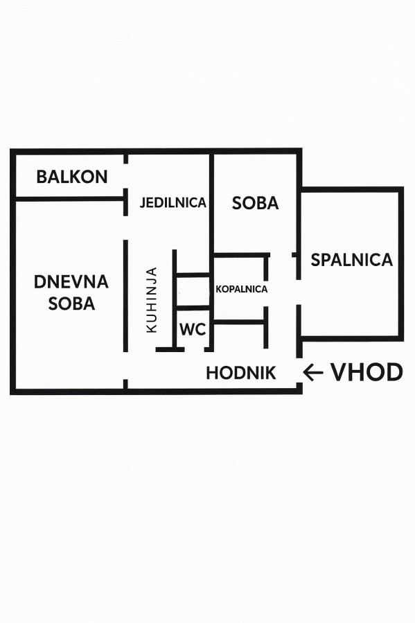 Razporeditev: Vstop v stanovanje nas pripelje na hodnik, kjer je na desno kopalnica, ter dve sobi.Naravnost sledi ločen WC, kuhinja z jedilnico z izhodom na balkon ter v povezavi z dnevno-bivalnim prostorom.
