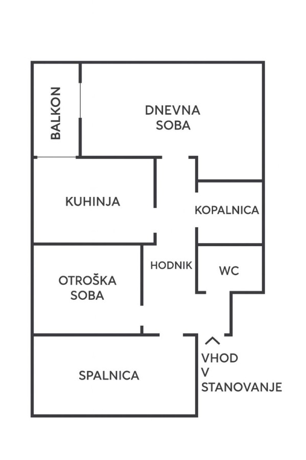 Tlorisna razporeditev stanovanja obsega: spalnico, otroško sobo, kuhinjo z jedilnico, dnevno-bivalni prostor, balkon, ločen wc in kopalnico.
