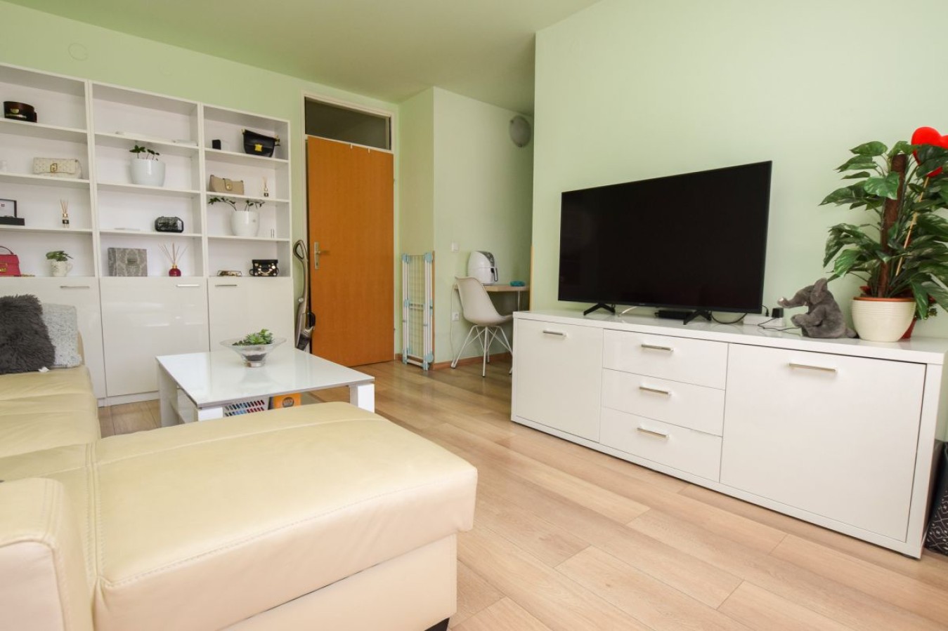 Razporeditev: Ob vstopu v stanovanje se nahaja predprostor, kopalnica. Nato imate naprej na levi strani kuhinjo z jedilnico, ločeno spalnico ter na desni strani dnevno-bivalni prostor.