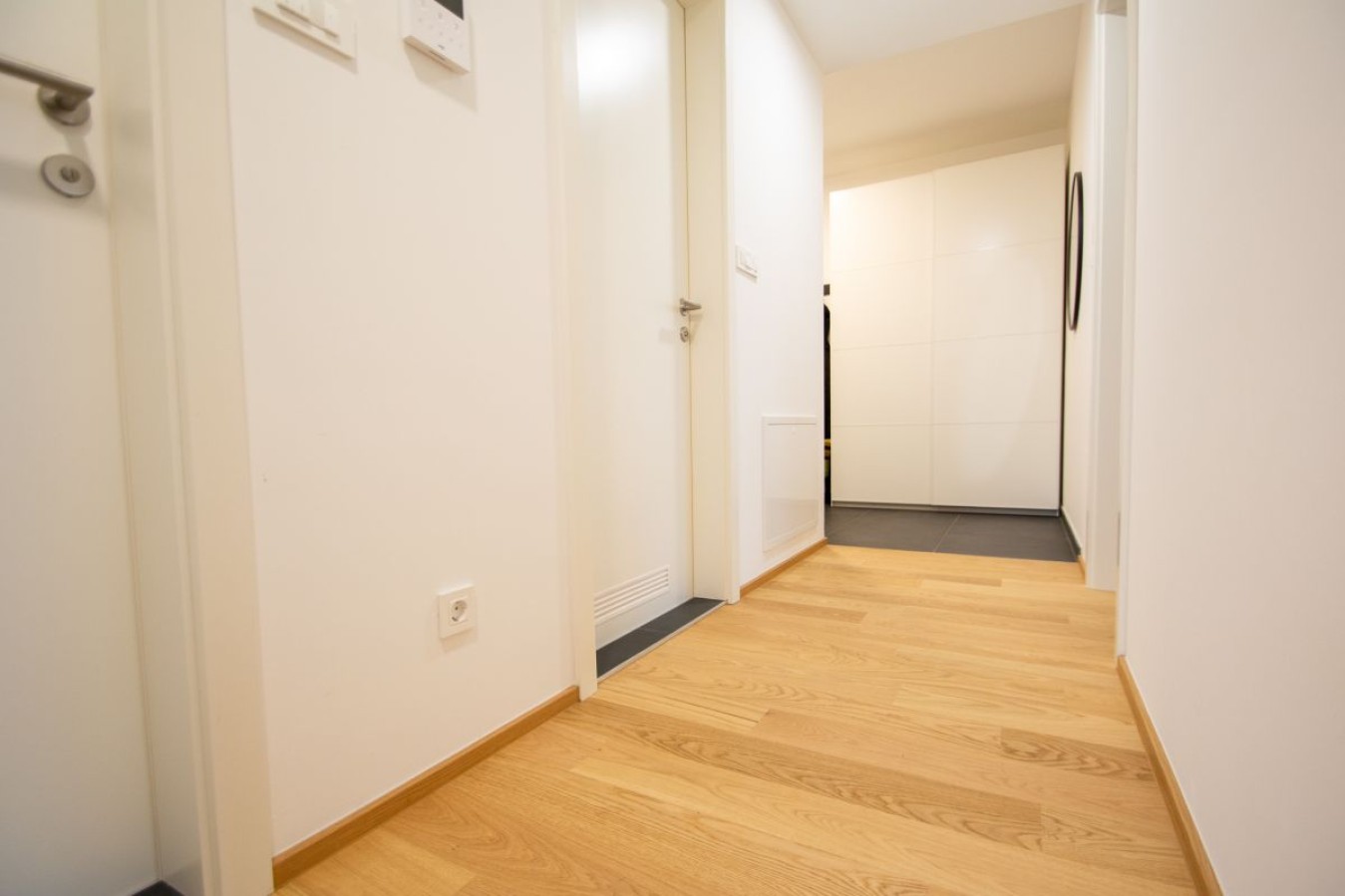 Razporeditev z uporabno površino 74,6 m2 (po podatkih gursa) je naslednja: Vstop v stanovanje nas pripelje na hodnik, kjer imate garderobni del, nato se naprej na levi strani nahajata spalnica ter otroška soba. Na desni strani hodnika pa sledi prostorna kopalnica ter ločen WC s prostorom za shranjevanje.