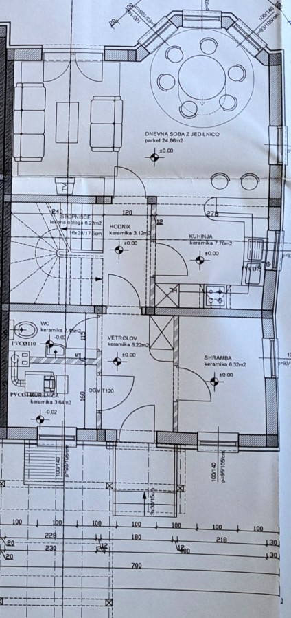 Pritličje: predsoba, kabinet, tehnični prostor/shramba, dnevni wc, dnevni prostor s kuhinjo in jedilnico