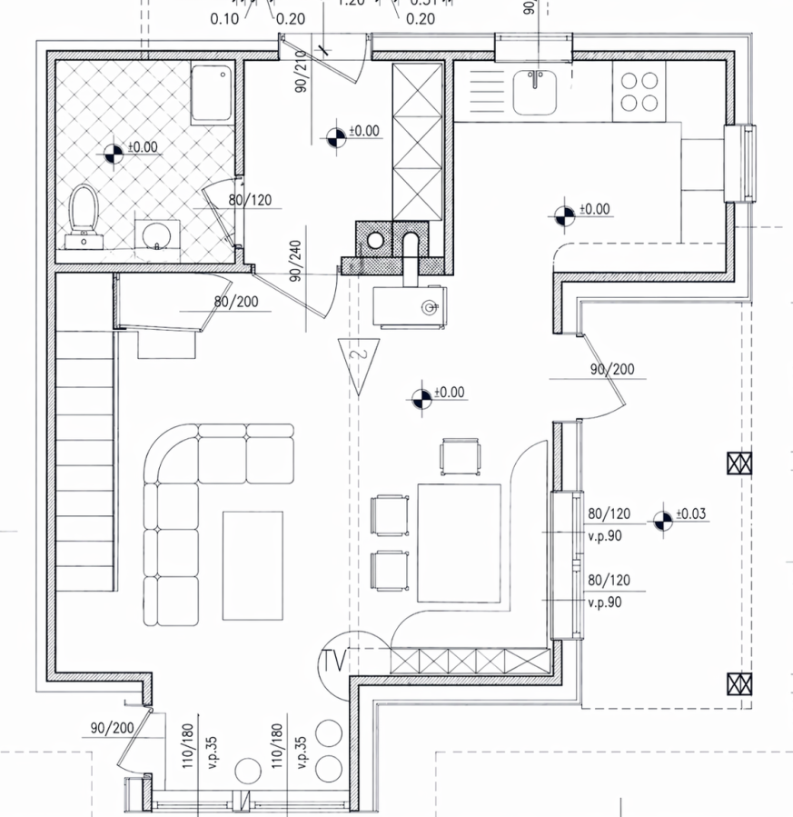 Pritličje: hodnik, kopalnica, dnevni prostor z jedilnico in kuhinjo, balkon