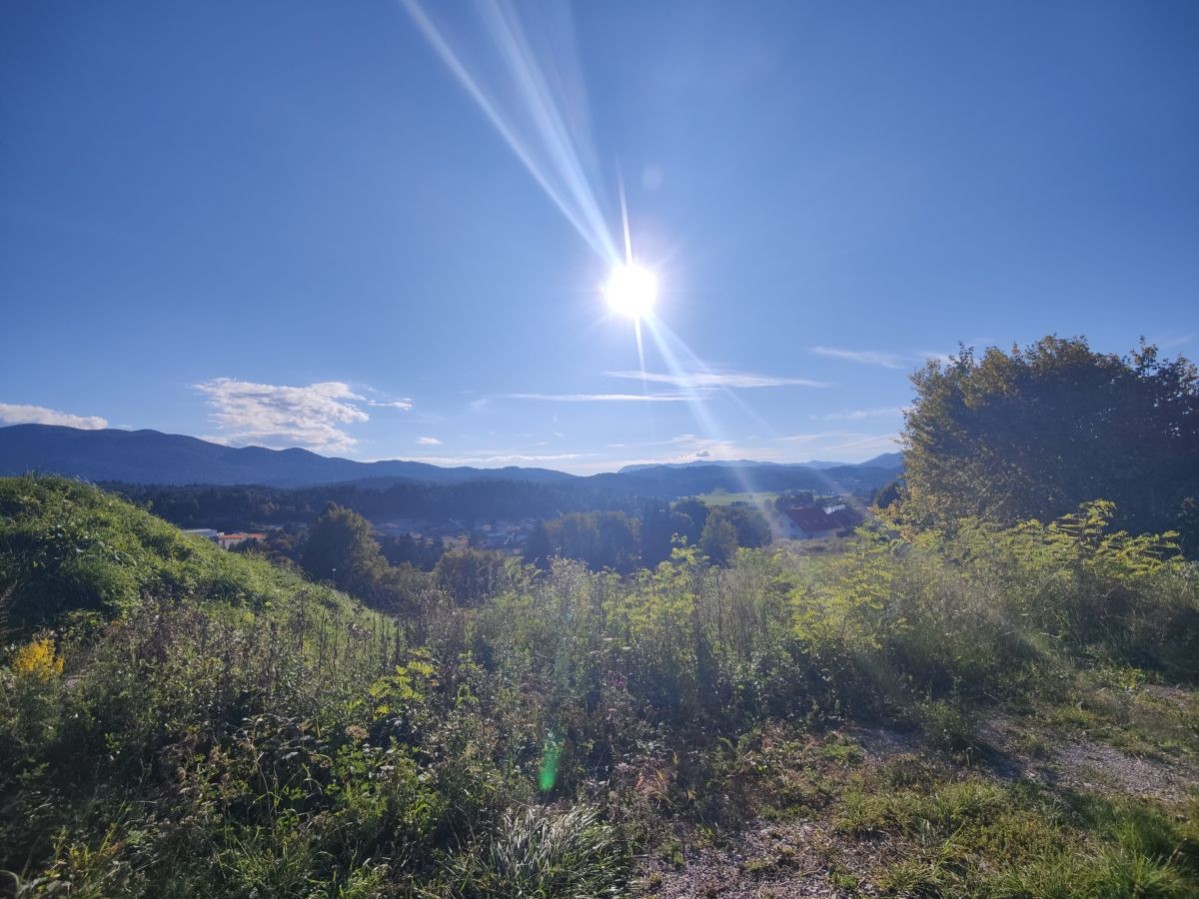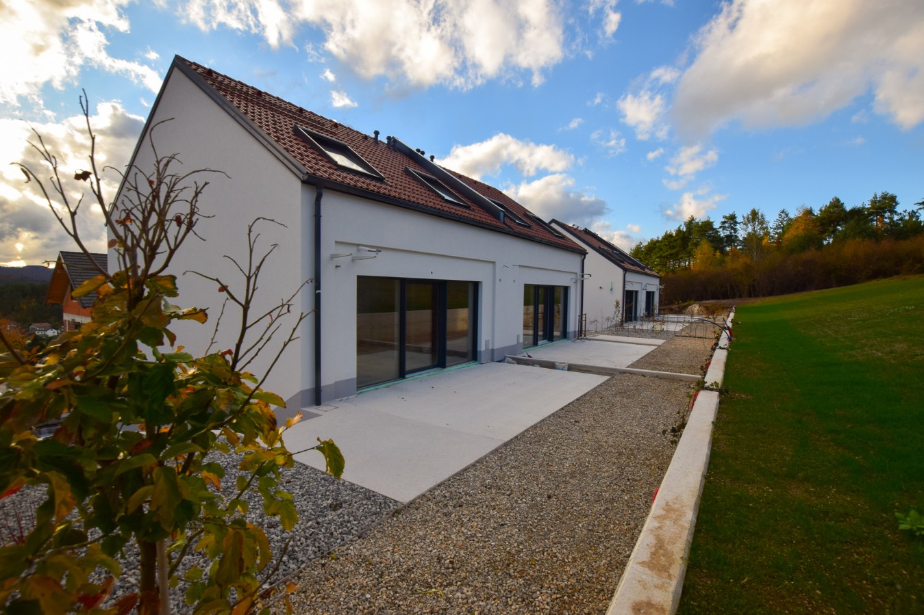 Zadnja vrsta hiš pred zelenim pasom, odprt razgled.
