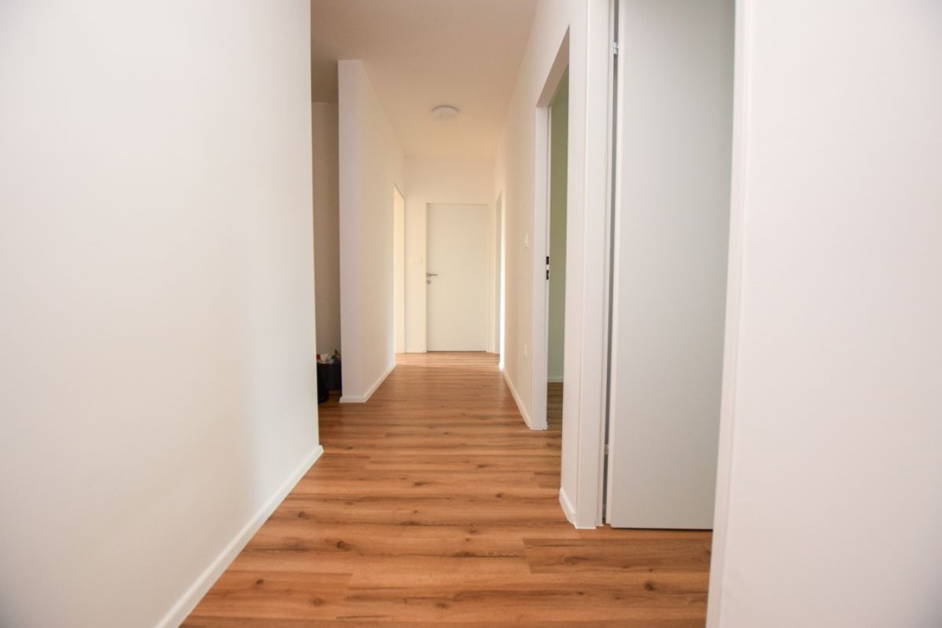 Razporeditev z uporabno površino 77,5 m2 (po podatkih Gursa) je naslednja: Ob vstopu v stanovanje nas hodnik popelje do vseh prostorov in sicer na desno do dveh otroških sob, spalnice, naravnost do ločenega WC-ja, na levo do kopalnice, garderobnega dela, kuhinje z jedilnico s prehodom v dnevno-bivalni prostor z izhodom na balkon. Vhod v dnevno sobo je prav tako možen z hodnika.