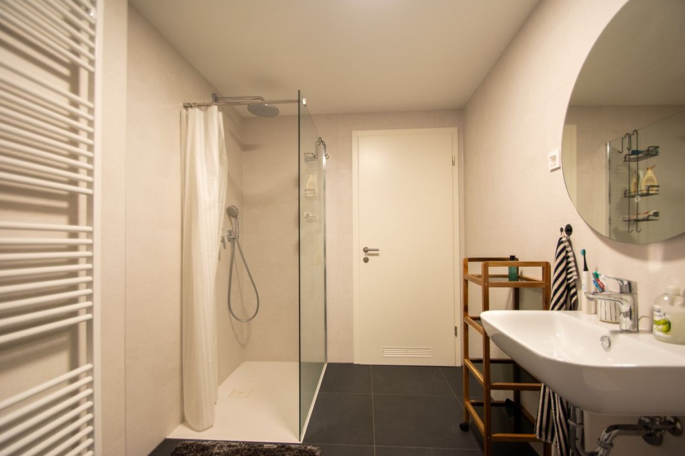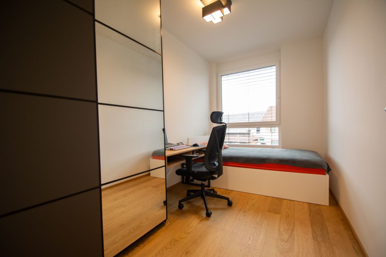 Razporeditev z uporabno površino 74,6 m2 (po podatkih gursa) je naslednja: Vstop v stanovanje nas pripelje na hodnik, kjer imate garderobni del, nato se naprej na levi strani nahajata spalnica ter otroška soba. Na desni strani hodnika pa sledi prostorna kopalnica ter ločen WC s prostorom za shranjevanje.