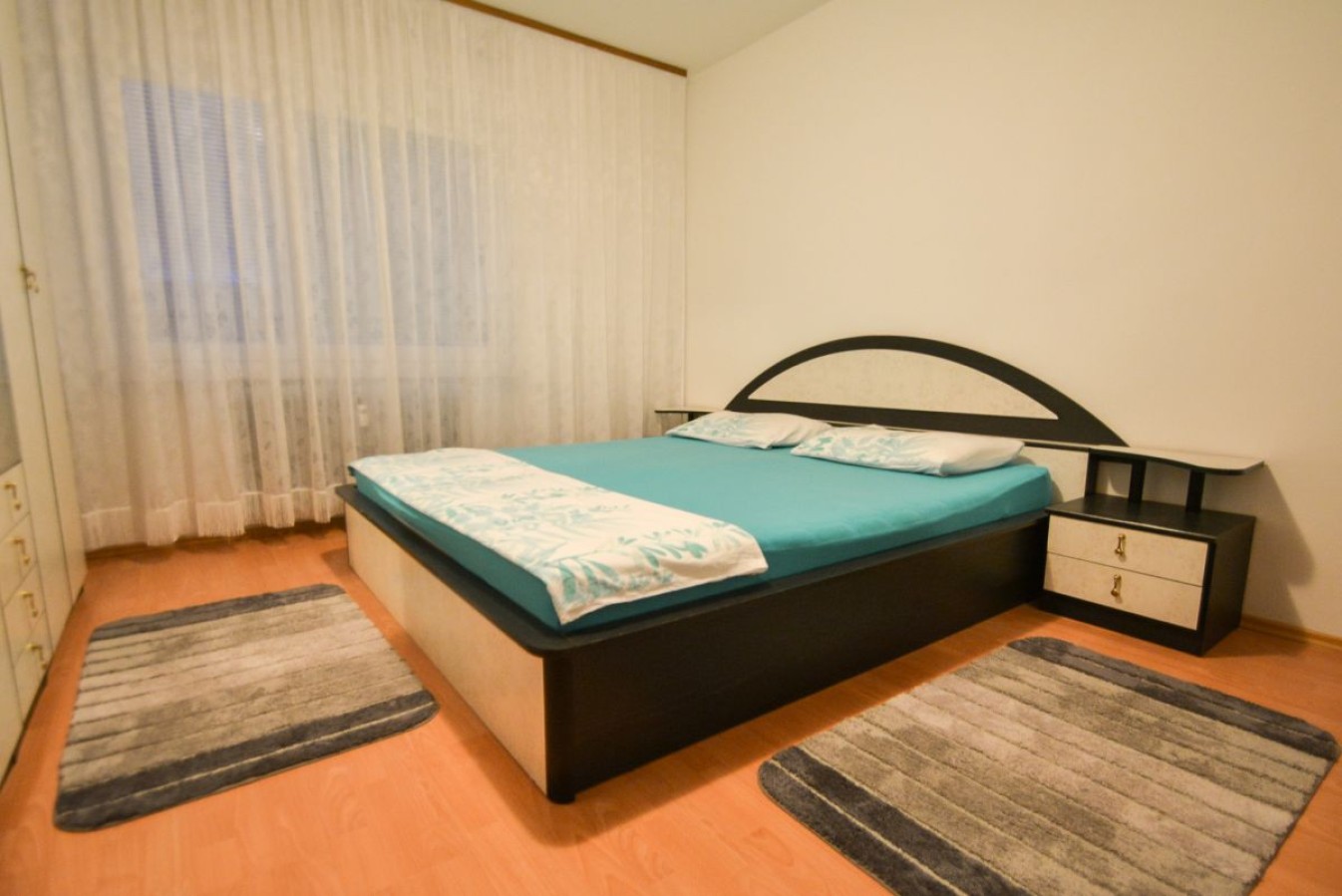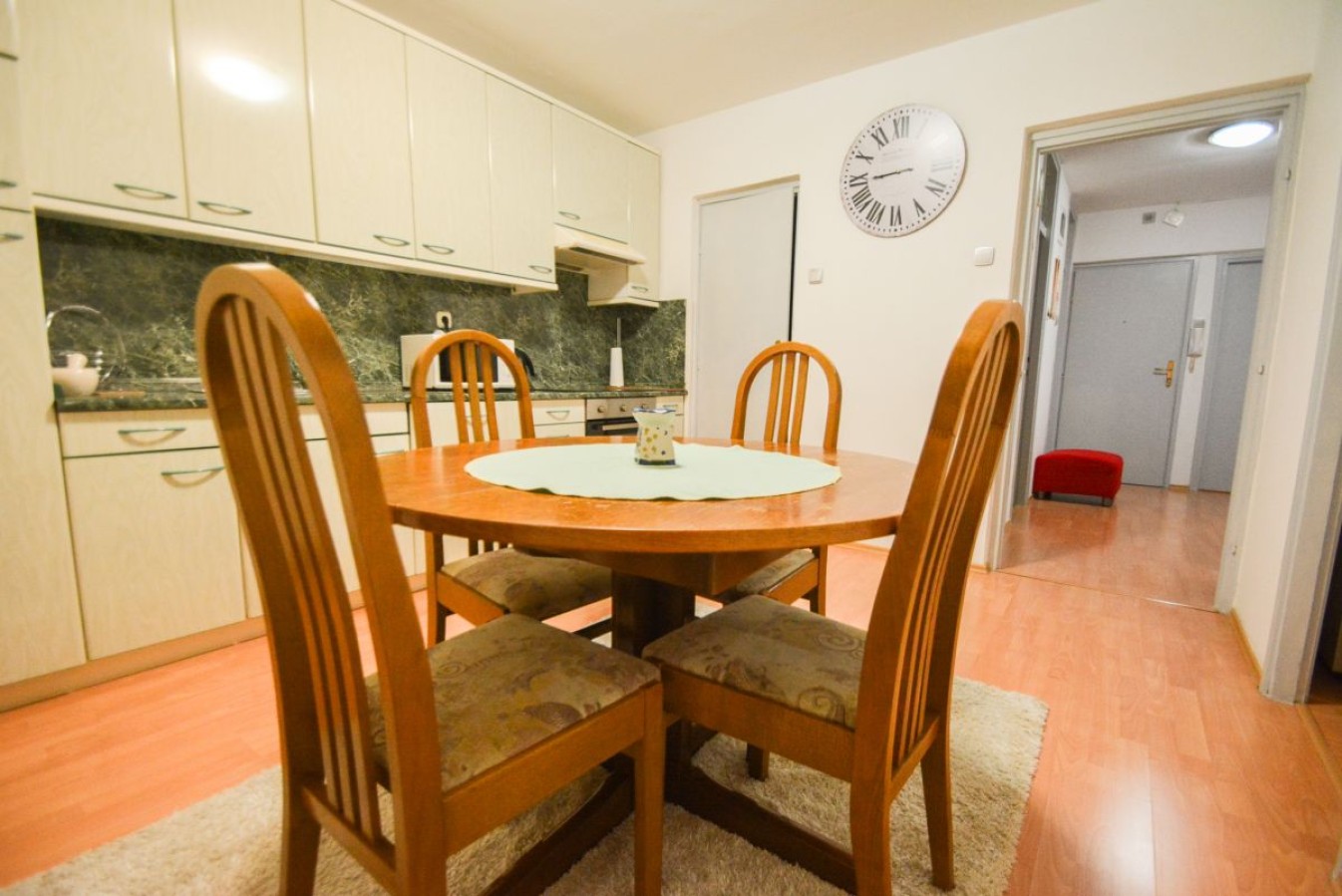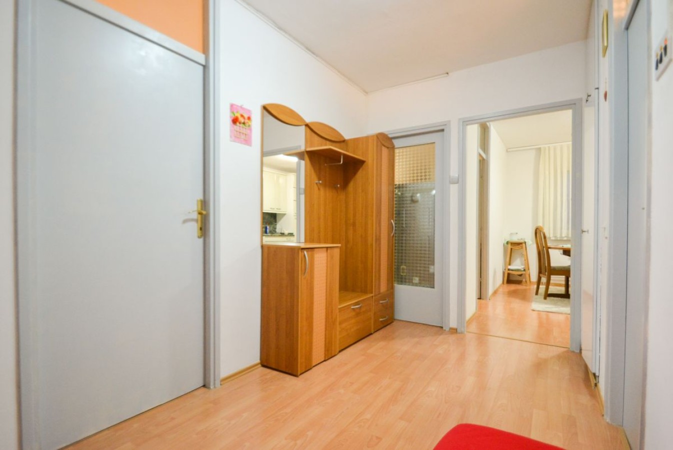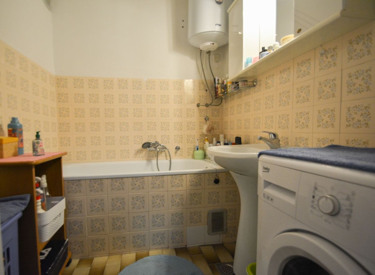 Razporeditev: Stanovanje obsega predprostor oziroma hodnik, ki nas vodi do vseh prostorov in sicer na desni strani do ločenega WC-ja, kopalnice, naravnost do kuhinje s prehodom v dnevno sobo z izhodom na balkon. Dostop v dnevno sobo je možen tudi iz hodnika. Na levi strani pa se nahaja spalnica z izhodom na balkon, ter otroška soba.